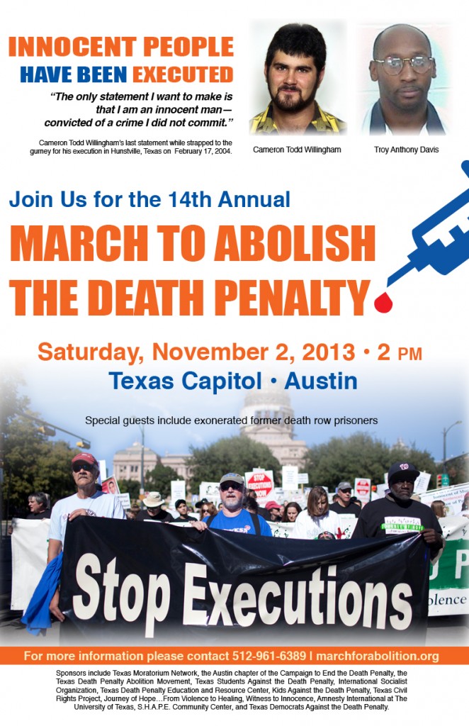 | This Saturday, November 2, 2013, is the 14th Annual March to Abolish the Death Penalty in Austin at the Texas Capitol at 2 PM on Saturday. Meet on the South Steps of the Capitol. We will march through the streets of downtown Austin with a stop in front of the Texas Governor’s mansion and return to the Texas Capitol.