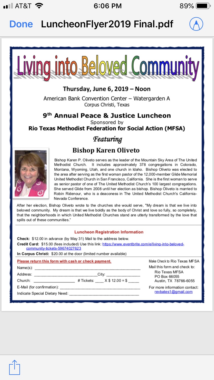 MFSA Witness Planned for Rio Texas Annual Conference Peace & Justice Luncheon Features Bishop Karen Oliveto